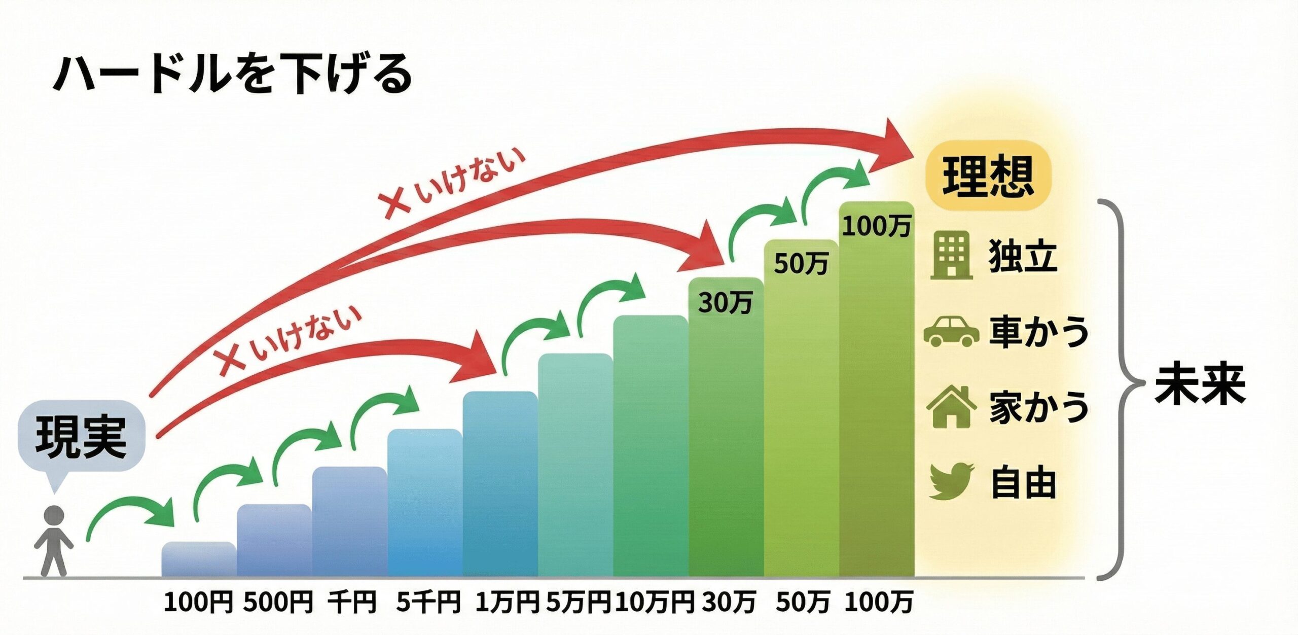 (※いきなり遠くの「理想」を目指すと挫折しちゃうので、まずは目の前の低い階段から上っていくイメージです。)